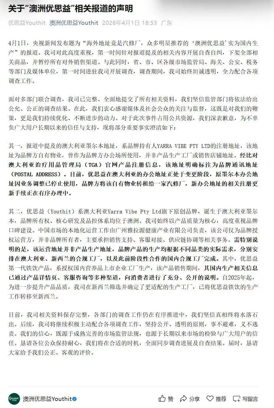 该品牌仍强调,优思益(Youthit)系澳大利亚Yarra Vibe Pty Ltd旗下原创品牌,诞生于澳大利亚墨尔本,品牌所有权、核心研发及品控体系均位于澳洲。“目前,我司相关资料保存完整,各部门的调查工作仍在有序推进中,我们坚信真相终将水落石出。”